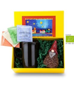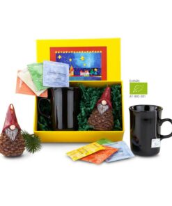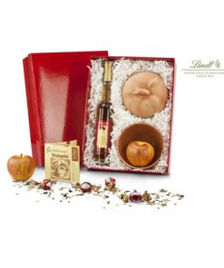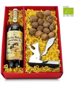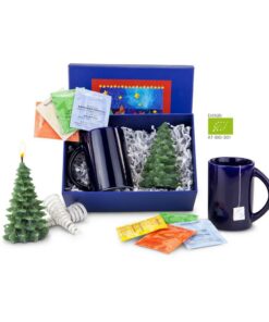 Blau in Blau: Die blaue 0,75 l ROMINOX® Isolierkanne mit den 2 Bechern ist kombiniert mit einer Flasche Altbayerischem Holunderglühwein (1 l) mit schönem Bügelverschluss. Das Ganze liegt natürlich in einem blauen Geschenkkarton!