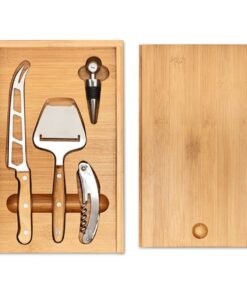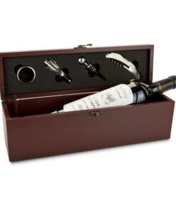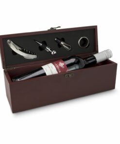 Rotwein kombiniert mit einem Buche-Block inkl. Weinaccessoires: Korkenzieher, 2 Tropfringe, Weinthermometer, Flaschenstopfen & Ausgießer.