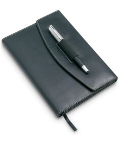 DIN A6 Notizbuch. 70 Blatt recyceltes Blankopapier. Mit Kugelschreiber aus recyceltem Papier mit biologisch abbaubaren Kunststoffteilen. Blaue Tinte.