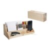 Büroträume werden wahr! Dieses Set ist etwas für Organisationstalente, Naturfreunde und Weinliebhaber zugleich. Die originelle Rackpack® Weinverpackung für eine Flasche Rive Haute Merlot (0,75 l) wird mit wenigen Handgriffen zu einem schicken Schreibtisch Organizer aus Fichtenholz. Eine wirklich nachhaltige Idee! Dazu liefern wir ein Schreibset inkl. Holzlineal, Kugelschreiber, Bleistift, Spitzer und Radiergummi in einer Leinentasche, einen Notizblock und je 100 schwarze und 100 rote Büroklammern – so kann der kleine Butler bei der nächsten guten Idee am Schreibtisch direkt genutzt werden. Mit Aussparung zur Ablage und Aufladung eines Handys. Rackpack Holzbox ohne Inhalt: 2A006