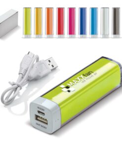 Kunststoff Powerbank mit 2200mAh, lieferbar in vielen verschiedenen Farben. Einzeln verpackt inkl. Ladekabel.