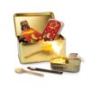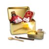 Weihnachtlich spritziges Präsent “Raffael” in Gold: Kleinste Sektflasche der Welt, ein Wondercake (Kuchen in der Dose) und eine Wunderkerze.