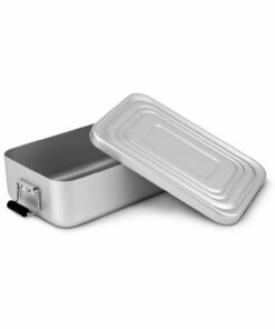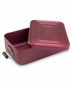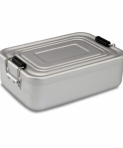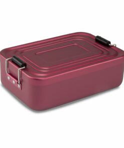 Klassisch, praktisch, leicht und stabil, hygienisch verschließbare Proviantbox mit Dichtungsring, matte Oberfläche (Aluminium – eloxiert, mattiert, Kunststoff, ohne Inhalt). Die Lunchbox ist in folgenden Varianten erhältlich: glänzend Silber, glänzend Rot, matt Silber, matt Rot und matt Blau sowie als XL Model in glänzend Rot und Silber.
