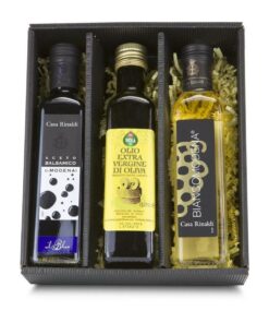 Dieses Set enthält je 1 Flasche Aceto und Olivenöl (je 100 ml), ein Glas Pfefferkörner (20 g), grobes Meersalz (40 g) & zwei ROMINOX Mühlen.