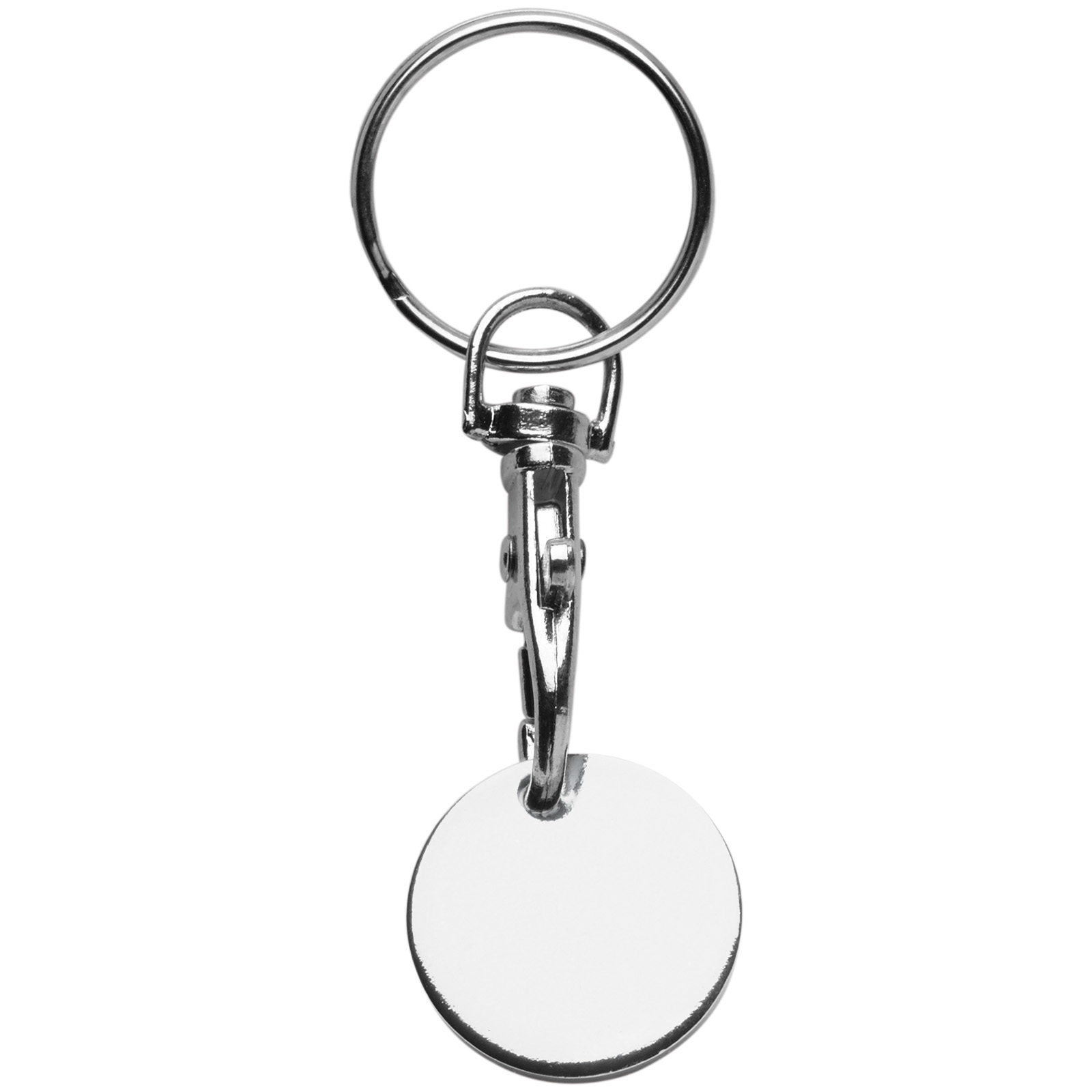 Metall Einkaufswagenchip mit Karabiner am Schlüsselanhänger. Einfach am Schlüssel zu befestigen. Passt in Wagen mit € 0,50 und € 1,00.