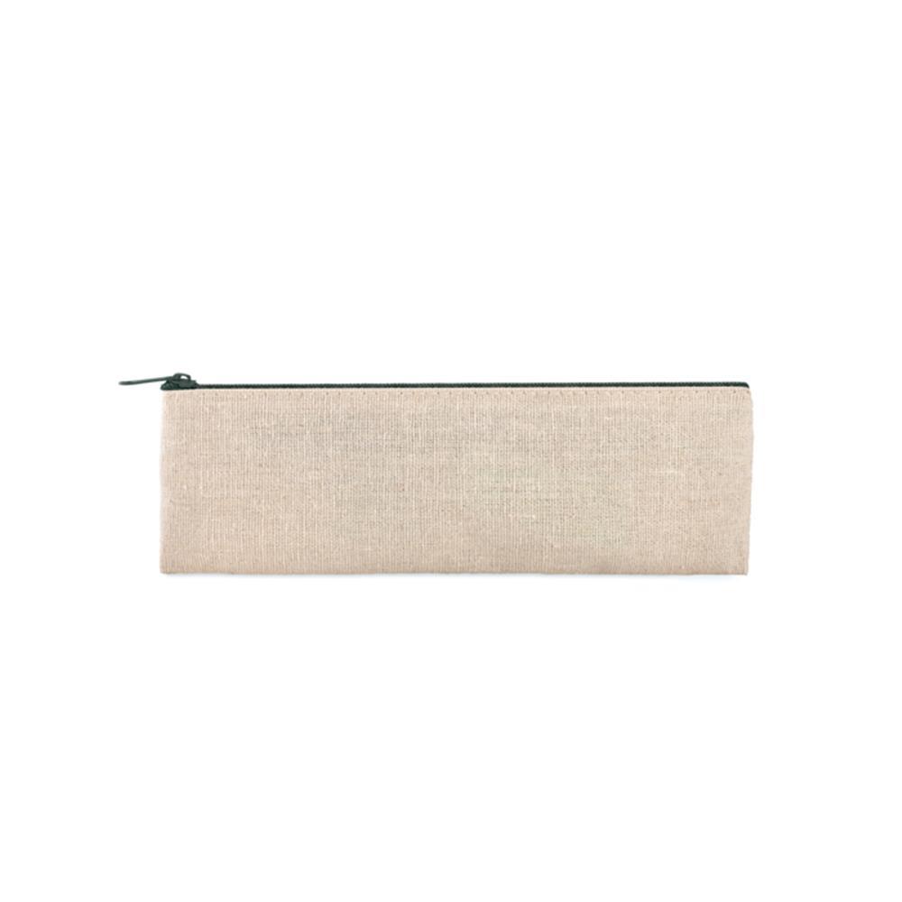 6-teiliges Schreib-Set. Etui aus Jute und Baumwolle. Kugelschreiber, Bleistift, Lineal aus Bambus, Spitzer und Radierer. Blaue Tinte.