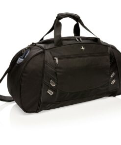 Sporttasche mit mehreren Fächern, verstellbarem Schultergurt und einer Ohrhörer-Öse. 600D Polyester.