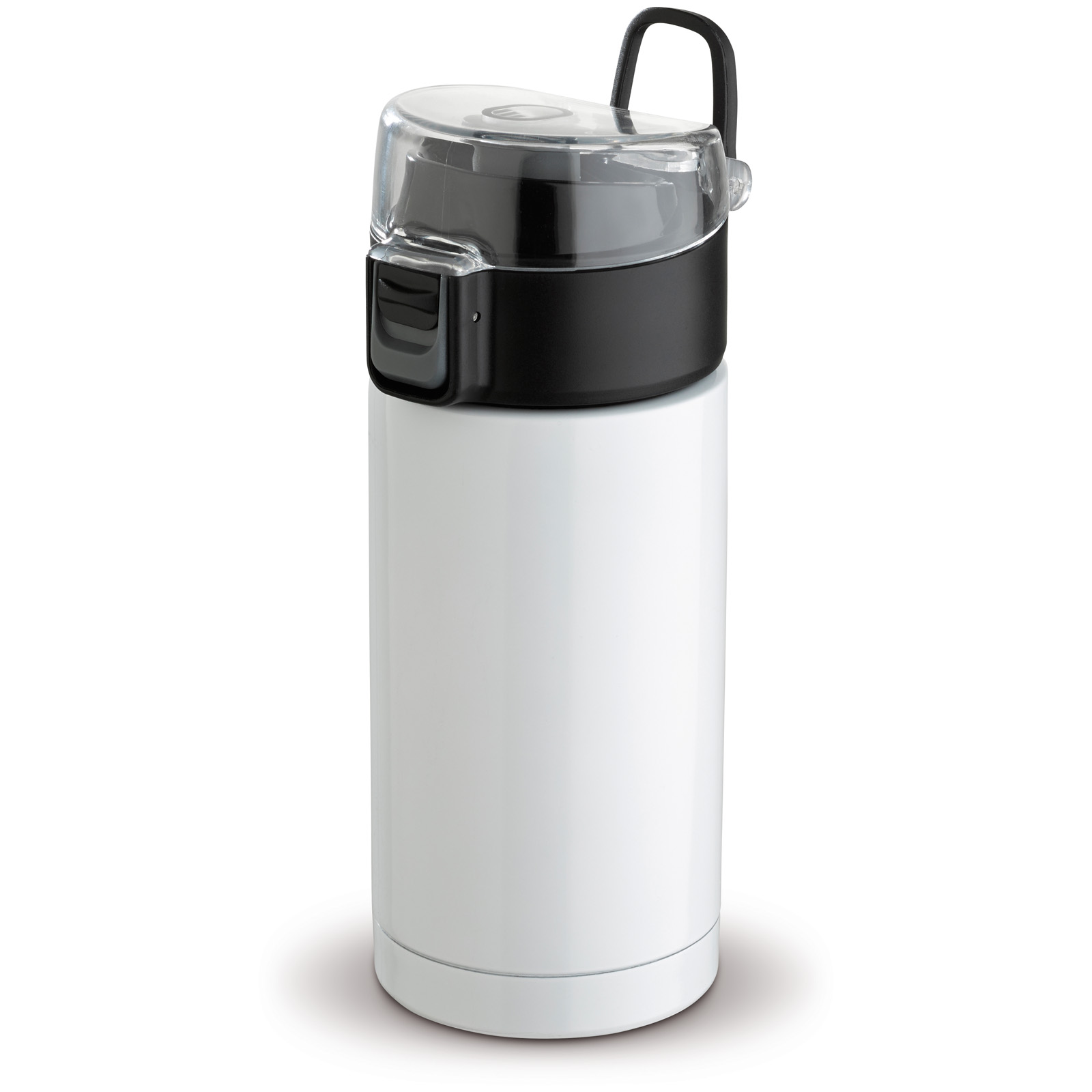 Dieser Thermobecher ist 100% dicht und enthält einen Sicherheitsknopf, damit der Inhalt des Bechers noch besser geschützt wird. Der Becher kann nur dadurch geöffnet werden, indem man den Knopf auf dem Becher hoch schiebt bis er arretiert. Somit komplett auslaufsicher. Mit der großen Druckfläche ein schöner Werbeträger.