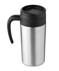 Doppelwandiger Trinkbecher aus Edelstahl mit schwarzen PP Deckel. Füllmenge: 400 ml.