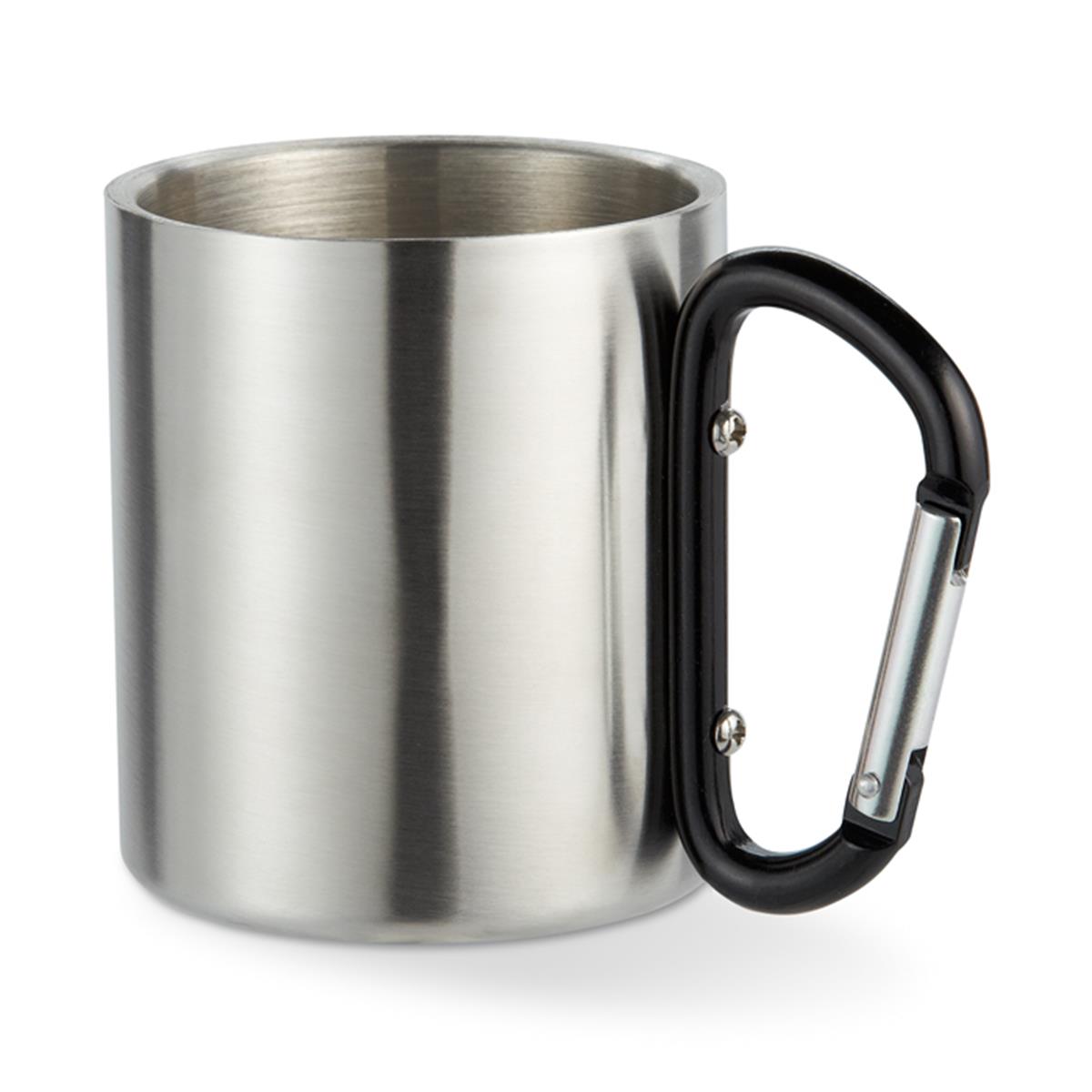 Doppelwandiger Trinkbecher aus Edelstahl. Henkel mit Karabiner. Füllmenge: 220 ml. Der Karabiner ist NICHT als Sicherung beim Klettern geeignet.